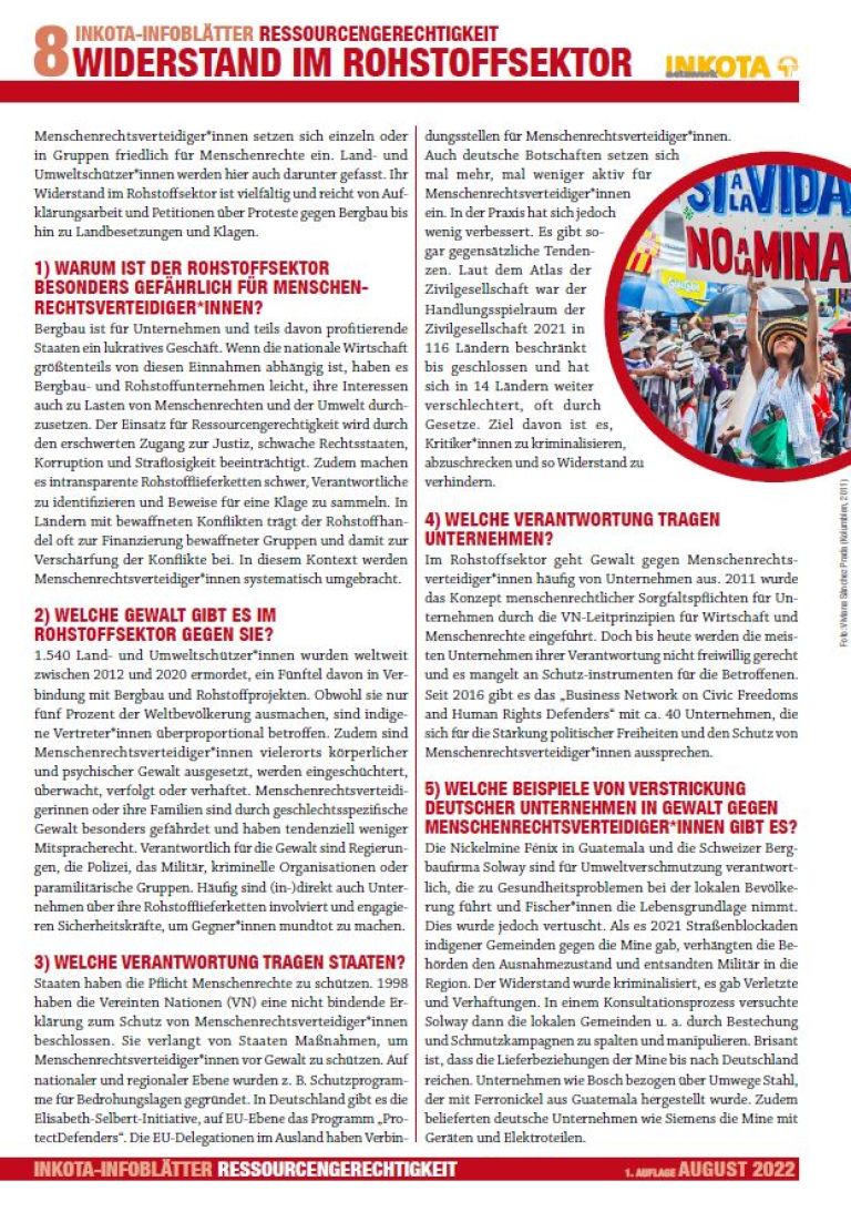 Doch warum ist der Rohstoffsektor für Menschenrechtsverteidiger*innen so gefährlich und welchen Formen der Gewalt sind sie ausgesetzt? Welche Verantwortung tragen Staaten und Unternehmen gegenüber Menschenrechtsverteidiger*innen? Und welche Beispiele von Verstrickung deutscher Unternehmen in Gewalt gegen sie gibt es? Das INKOTA-Infoblatt Widerstand im Rohstoffsektor beantwortet diese und weitere Fragen. Es zeigt Ansätze auf deutscher und internationaler Ebene auf, wie Menschenrechtsverteidiger*innen und ihre Rechte im Rohstoffsektor geschützt werden können.