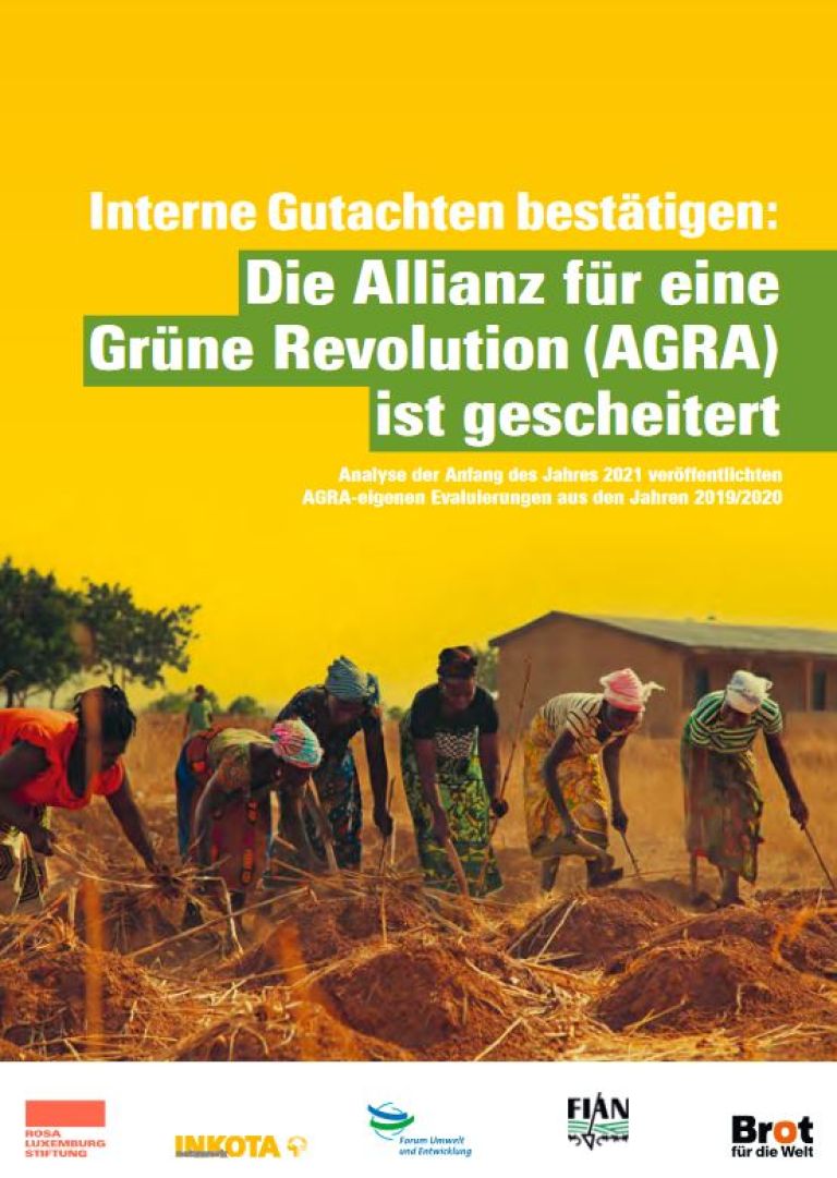 Im Juli 2020 haben die Rosa-Luxemburg-Stiftung, das INKOTA-netzwerk, Brot für die Welt, Forum Umwelt und Entwicklung, FIAN Deutschland und fünf afrikanische Organisationen die Studie „Falsche Versprechen: Die Allianz für eine Grüne Revolution in Afrika (AGRA)“ veröffentlicht. Das Papier ist die erste Studie, die die Wirkungen, der auch von der Bundesregierung unterstützten Agrarallianz wissenschaftlich bewertet. Zentral war die Frage, ob AGRA ihre eigenen Ziele, die landwirtschaftlichen Erträge und die Einkommen von 30 Millionen kleinbäuerlichen Haushalten zu verdoppeln und damit sowohl Hunger als auch Armut in 20 afrikanischen Ländern bis 2020 zu halbieren, erreicht hat. Die Ergebnisse der Studie zeigten deutlich das Scheitern von AGRA auf.