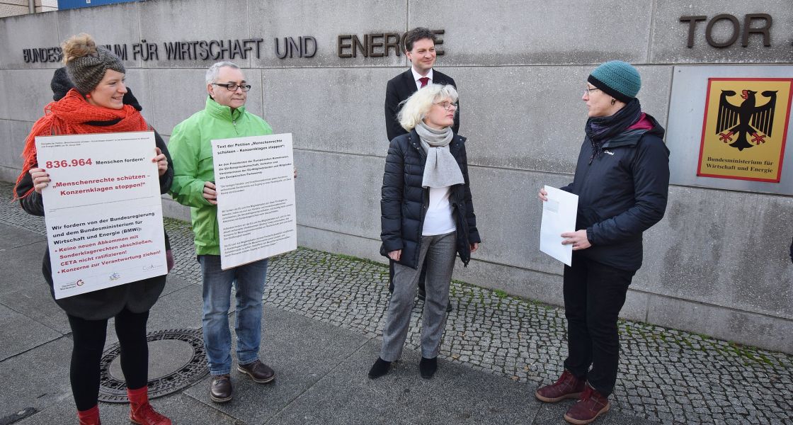 836.964 Unterschriften gegen Sonderklagerechte für Konzerne und dafür, dass Unternehmen für Menschenrechtsverletzungen und Umweltschäden zur Rechenschaft gezogen werden – das ist das fulminate Ergebnis der Unterschiftensammlung „Menschenrechte schützen – Konzernklage stoppen!“, die von einem europaweiten Bündnis aus über 200 Organisationen getragen wurde. Letzte Woche haben wir sie dem Bundeswirtschaftsministerium in Berlin übergeben und die Kampagne damit beendet.