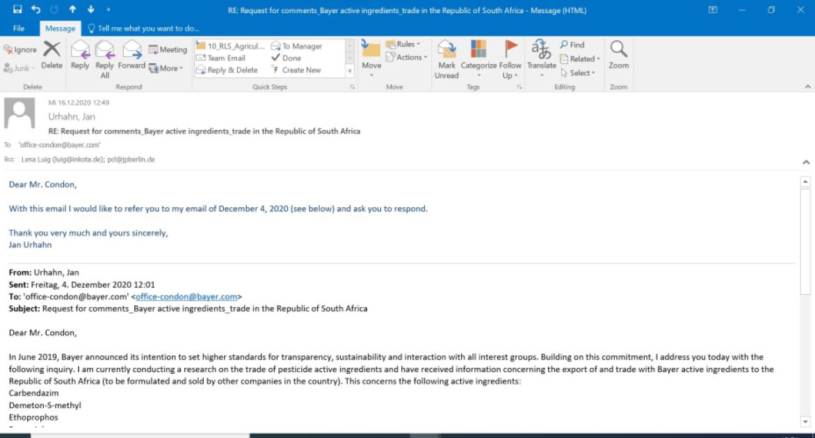 Wir haben genauso wie für unsere Studie im Jahr 2020 auch für unsere diesjährige Studie Bayer angeschrieben, um mehr über Bayer-Wirkstoffe in Südafrika zu erfahren. Unser Anschreiben ging an Liam Condon. Er ist Mitglied des Bayer-Vorstandes und unter anderem für Afrika zuständig. Genauso wie im letzten Jahr erhielten wir keine Antworten auf unsere Fragen. Dies steht im kompletten Gegensatz zu dem hier öffentlich beteuerten Wunsch nach einem Austausch. So stellen wir uns einen Dialog nicht vor.