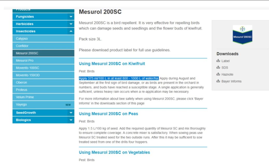 Falsch: Im Januar 2021 hat Bayer das Methiocarb-haltige Produkt Mesurol weiterhin auf der Bayer-Firmenwebseite für Neuseeland und Australien angeboten. Das zeigt unser Screenshot der Bayer-Webseite vom 19.1.2021: