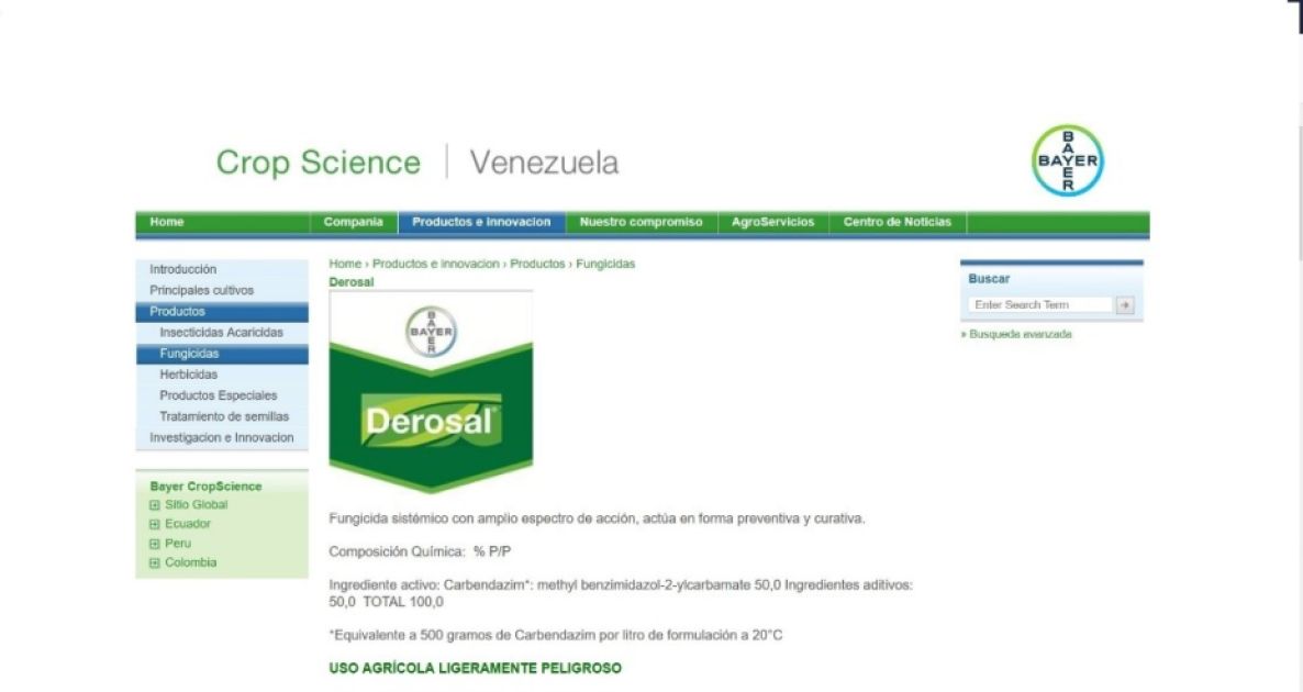 Aktuell wird von Bayer das Carbendazim-Produkt Derosal auf seiner venezolanischen Website beworben. Das zeigt unser Screenshot von der Bayer-Webseite in Venezuela vom 12.5.2021.