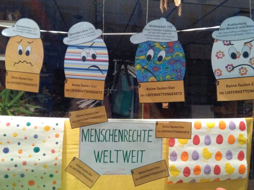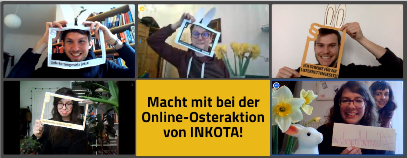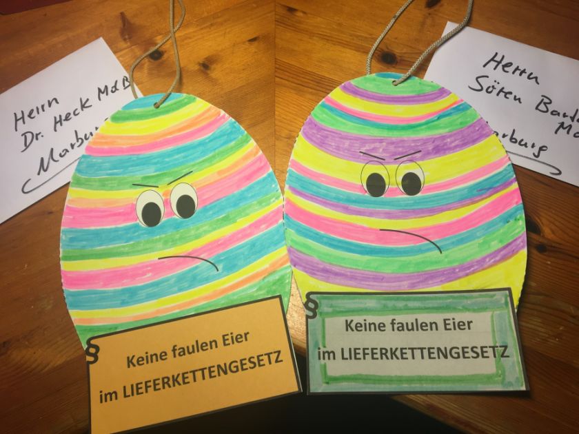 Unter anderem mit kreativen Aktionen zum Nikolaustag („Kein Stiefel für die CDU“) und zu Ostern („Keine faulen Eier im Lieferkettengesetz“) versuchte INKOTA deshalb, Druck auf Abgeordnete der Union aufzubauen, damit das Lieferkettengesetz noch rechtzeitig verabschiedet würde. 30.000 Lieferkettenbriefe wurden zudem in der entscheidenden Phase an Bundestagsabgeordnete aller demokratischen Parteien verschickt. Und tatsächlich: Der Druck wirkte! Nach der Einigung der Minister Müller, Heil und Altmaier im Februar 2021 und dem Kabinettsbeschluss im März 2021 wurde das „Lieferkettensorgfaltspflichtengesetz“ am 11. Juni 2021 durch den Deutschen Bundestag verabschiedet – in der vorletzten Sitzungswoche der Wahlperiode.