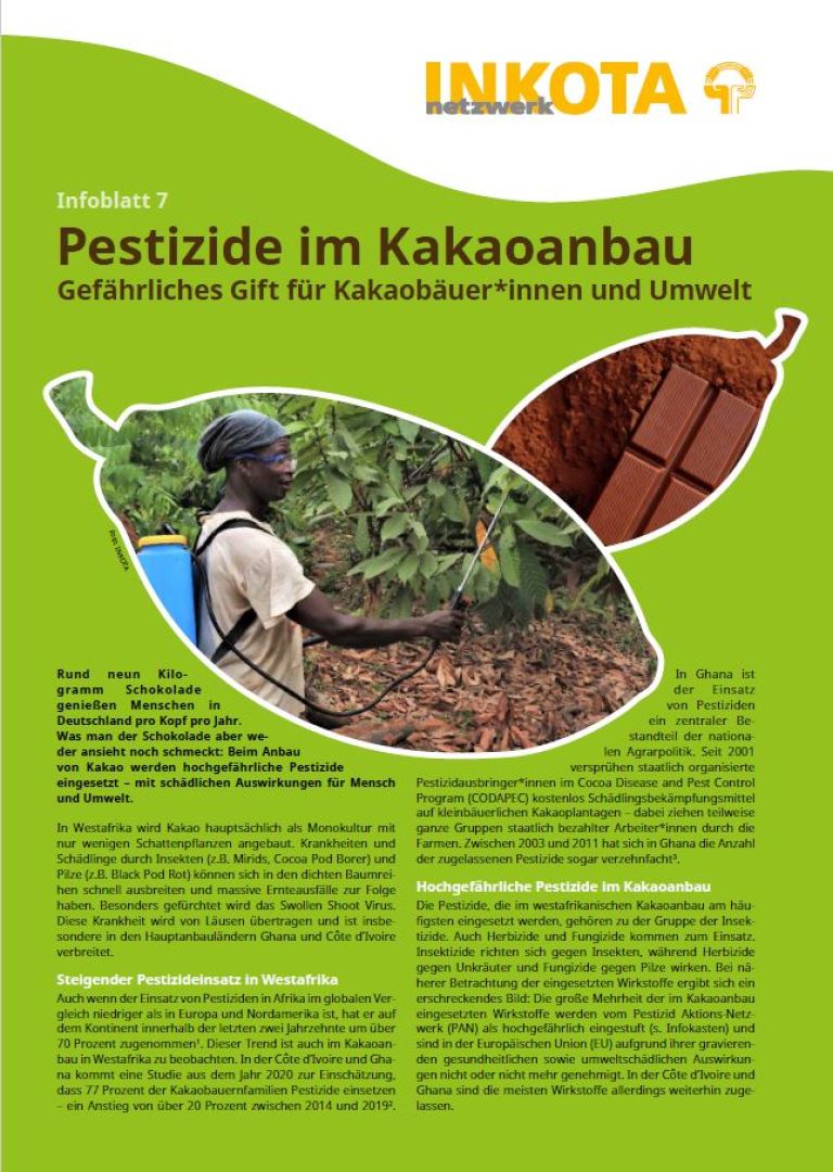 Das Infoblatt beleuchtet Ursachen und Auswirkungen des seit Jahren steigenden Pestizideinsatzes im Kakaoanbau in Westafrika und stellt alternative ökologische Anbaumethoden vor.