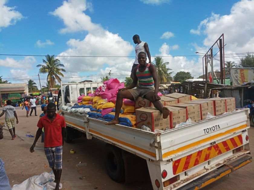 INKOTAs mosambikanische Partnerorganisationen ADECRU und UNAC leisten Nothilfe oder beteiligen sich am Wiederaufbau: ADECRU hat in einigen besonders betroffenen Dörfern in der Provinz Sofala bisher rund 500 Nothilfepakete verteilt. In den Paketen befanden sich u.a. Reis, Mehl, Zucker, Bohnen, Speiseöl, Seife und Kerzen für jeweils eine Familie. Dafür hat ADECRU einen Kleinlaster in Muxungue, einer Kleinstadt im Süden der Provinz Sofala, gemietet. Dort wurde auch der Inhalt der Pakete eingekauft. „Der Transport in die notleidenden Dörfer war schwierig: Die Straßen sind immer noch in einem sehr schlechten Zustand“, sagt Jeremias Vunhanje von ADECRU.