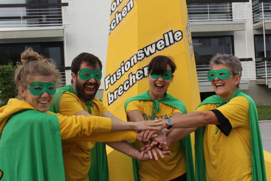 Hunderte DemonstrantInnen protestierten am 25. Mai bei der Bayer-Hauptversammlung im World Conference Center in Bonn – vor allem gegen die Übernahme des berüchtigten Gen-Saat- und Glyphosat-Herstellers Monsanto durch die deutsche Bayer AG. INKOTA hatte ein besonders großes Accessoire dabei: einen drei Meter hohen, knallgelben Wellenbrecher. In SuperheldInnen-Kostümen zeigten die AktivistInnen, wie die Fusionswelle im Agrarbereich gebrochen werden kann.