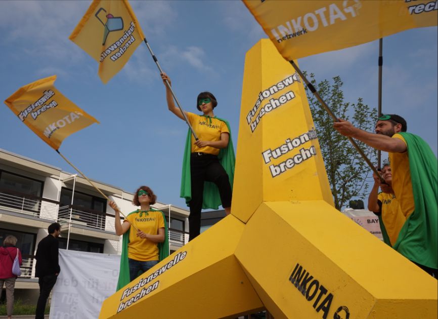 Zum Start der INKOTA-Kampagne „Fusionswelle brechen – kein weiteres Bayer-Monsanto!“ haben wir vor der Bayer-Hauptversammlung mit einem riesigen Wellenbrecher gegen die Bayer-Monsanto-Fusion protestiert. Die Bundesregierung kann mit einer Klage vor dem Europäischen Gerichtshof die Fusion noch verhindern. Und: INKOTA fordert mit einem Appell an die Bundesregierung, die Fusionskontrolle zu verschärfen.