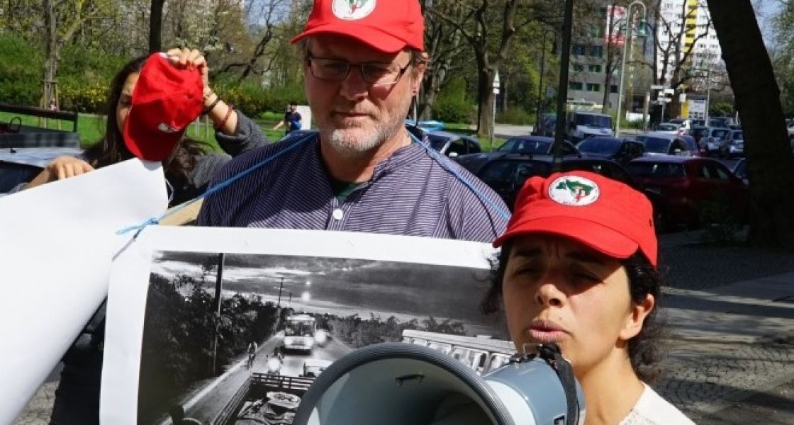Sprüche wie „Mit Via Campesina für Agrarreformen“ oder „Rechte von Bauern und Bäuerinnen stärken. Die kleinbäuerliche Landwirtschaft ernährt die Welt“ flatterten auf Spruchbändern vor der brasilianischen Botschaft im Wind. Die rund 20 Aktivist*innen von INKOTA und einigen weiteren Organisationen forderten die Stärkung der Kleinbauernrechte. Gemeinsam mit zwei VertreterInnen der brasilianischen Landlosenbewegung MST wurde ein Ende der Kriminalisierung sozialer Bewegungen in Brasilien verlangt. Anlass war der Tag des kleinbäuerlichen Widerstands, der seit nunmehr 22 Jahren jedes Jahr am 17. April zelebriert wird.
