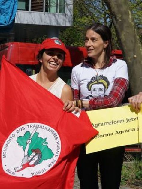 Zur Kundgebung aufgerufen hatten: Aktionsgemeinschaft Solidarische Welt (ASW), Arbeitsgemeinschaft bäuerliche Landwirtschaft (AbL), FIAN Deutschland e.V., Freundschaftsverein der Landlosenbewegung MST in Deutschland, Forschungs- und Dokumentationszentrum Chile-Lateinamerika (FDCL), FreundInnen des 17. April, INKOTA-netzwerk e.V., treemedia e.V.