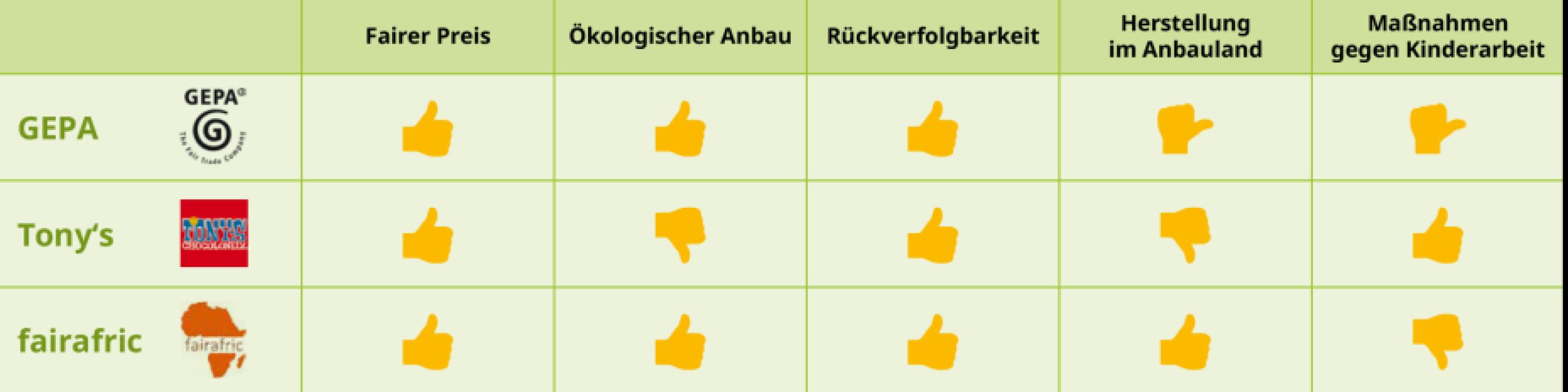 Doch einige Unternehmen haben sich vorgenommen, etwas daran zu ändern. Die GEPA versucht als größte europäische Importorganisation für fair gehandelte Waren, über die Standards von Fairtrade hinauszugehen. Das Unternehmen Tony’s Chocolonely aus den Niederlanden hat sich vorgenommen, kinderarbeitsfreie Schokolade zu produzieren – und zwar für den Massenmarkt. Und das Münchner Start-Up-Unternehmen Fairafric versucht, durch die Verlagerung der Schokoladenproduktion nach Ghana neue Wege zu gehen.