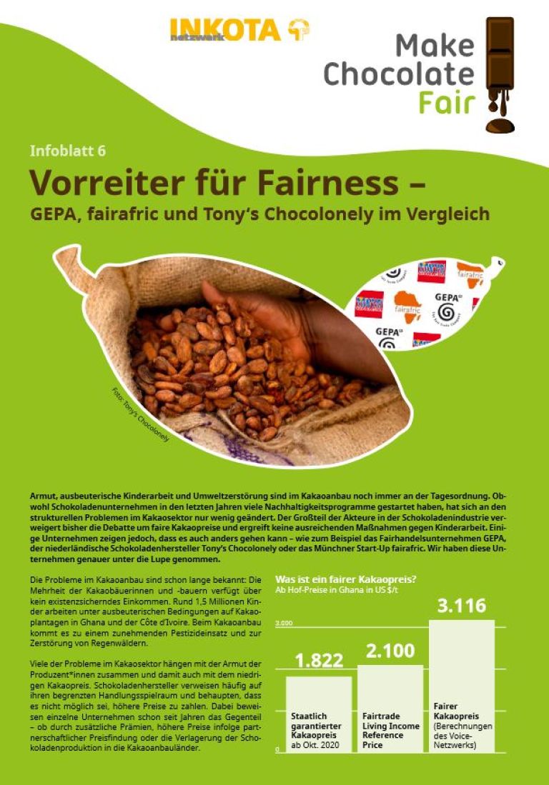 Armut und ausbeuterische Kinderarbeit sind im Kakaoanbau in Westafrika noch immer weit verbreitet. Denn der Großteil der Akteure in der Schokoladenindustrie verweigert bisher die Debatte um faire Kakaopreise und ergreift keine ausreichenden Maßnahmen gegen Kinderarbeit. Dabei zeigen einige Unternehmen, dass es auch anders gehen kann. Das neue Infoblatt „Vorreiter für Fairness“ der INKOTA-Kampagne Make Chocolate Fair! hat einige dieser Vorreiter genauer unter die Lupe genommen: das Fairhandelsunternehmen GEPA, den niederländischen Schokoladenhersteller Tony’s Chocolonely und das Start-Up Fairafric.