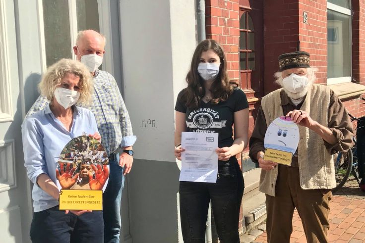 Kurz vor der parlamentarischen Beratung zum Lieferkettengesetz fordern Unterstützer*innen von INKOTA quer durch Deutschland von ihren lokalen Bundestagsabgeordneten: „Keine faulen Eier im Lieferkettengesetz!“