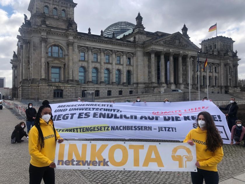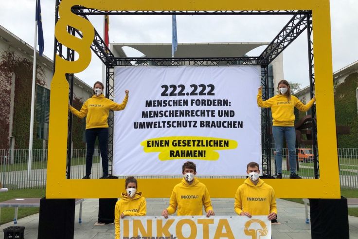Mit der „Initiative Lieferkettengesetz“ hat sich INKOTA deshalb gemeinsam mit über 100 Entwicklungs- und Umweltorganisationen, Gewerkschaften und kirchlichen Akteuren für einen gesetzlichen Rahmen eingesetzt, der Unternehmen zur weltweiten Achtung der Menschenrechte verpflichtet. Unsere Forderung: Unternehmen, die für Schäden an Mensch und Umwelt in ihren Lieferketten mitverantwortlich sind, müssen dafür haften. Geschädigte aus Produktionsländern müssen auch vor deutschen Gerichten Entschädigungen einklagen können.