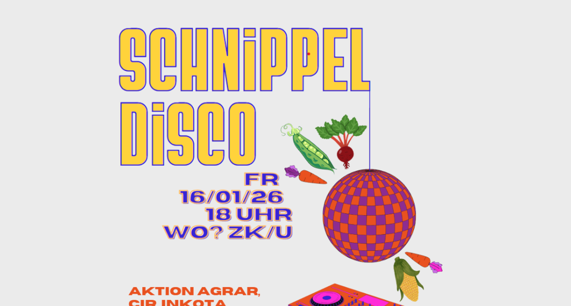 Auch 2026 findet am Vorabend der "Wir haben es satt!"-Demo wieder eine große Schnippeldisco statt: eine öffentliche Veranstaltung, bei der Menschen zusammenkommen, um gerettetes, oft krummes Gemüse, das sonst weggeworfen würde, zu einer Suppe gemeinsam zu verarbeiten. Dazu gibt es frische Tanzmusik von verschiedenen DJs, Workshops und leckere Heißgetränke. Am nächsten Tag wird die Suppe nach der „Wir haben es satt“-Demonstration an Teilnehmer*innen verteilt.